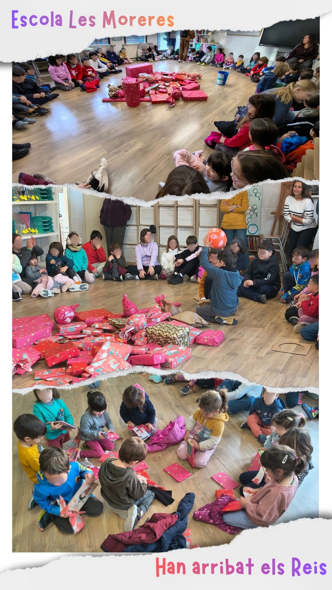 Així, després de retrobar-nos amb els companys de classe i explicar-nos com havien anat aquestes festes, ens hem trobat tots els alumnes de l’escola a la classe gran per tal d’obrir els regals que ens havien deixat els Reis.