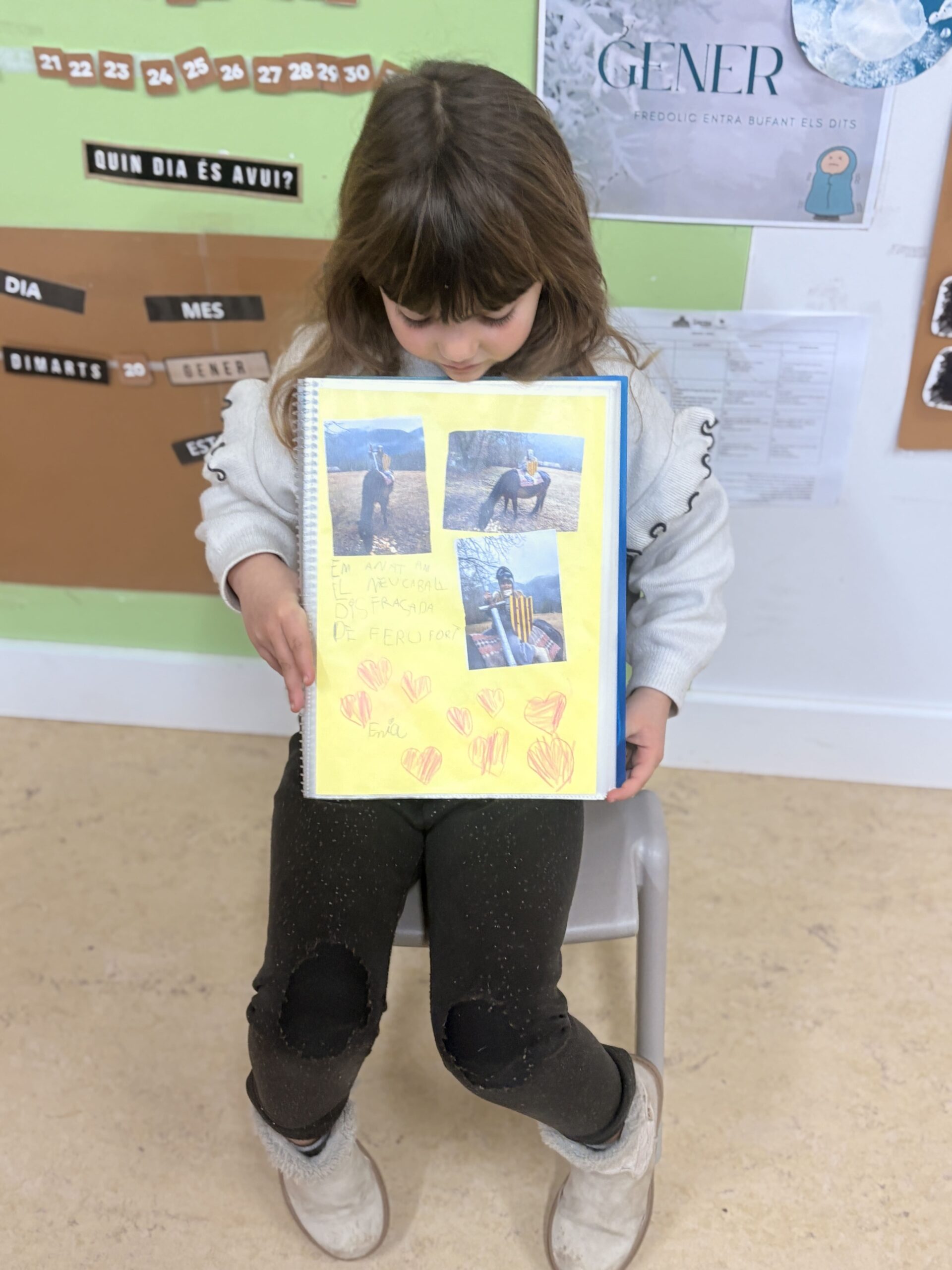 Cada setmana, un nen o nena s’enduu la llibreta viatgera on hi escriu, dibuixa, enganxa fotografies… de com ha anat el cap de setmana amb la disfressa de cavaller. A l’aula, explica a la resta de companys la seva aventura!
