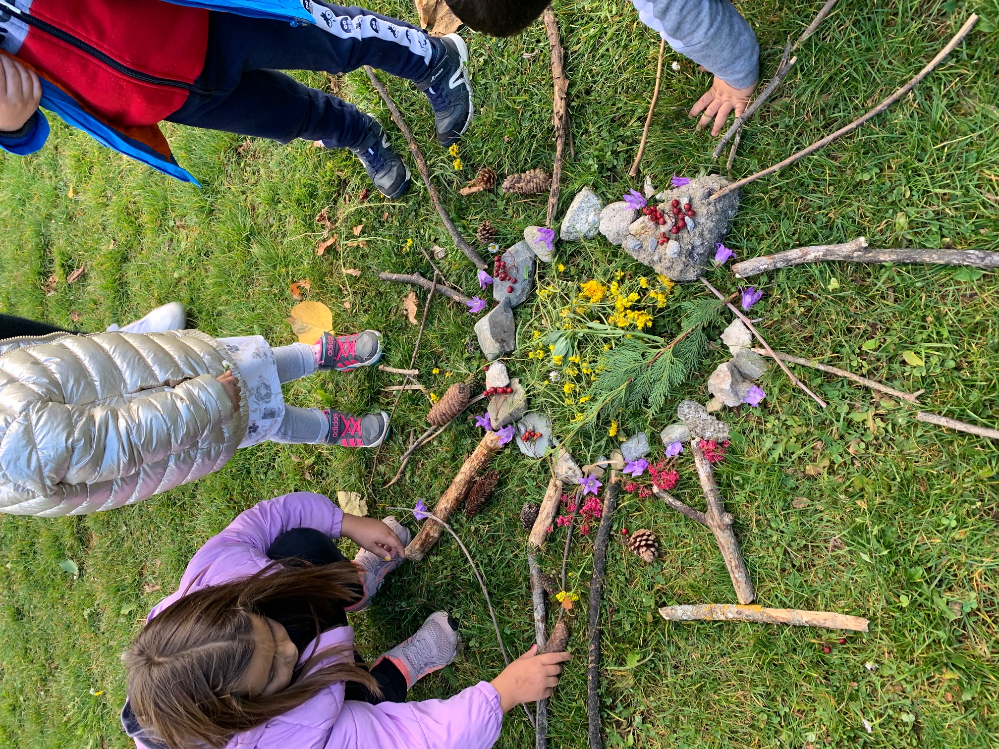 Tot caminant, vam recollir fulles, tronquets, pedres, flors de tots colors, herbes… i quan vam arribar al camp de futbol, en vam construir una mandala amb tots aquests elements naturals.