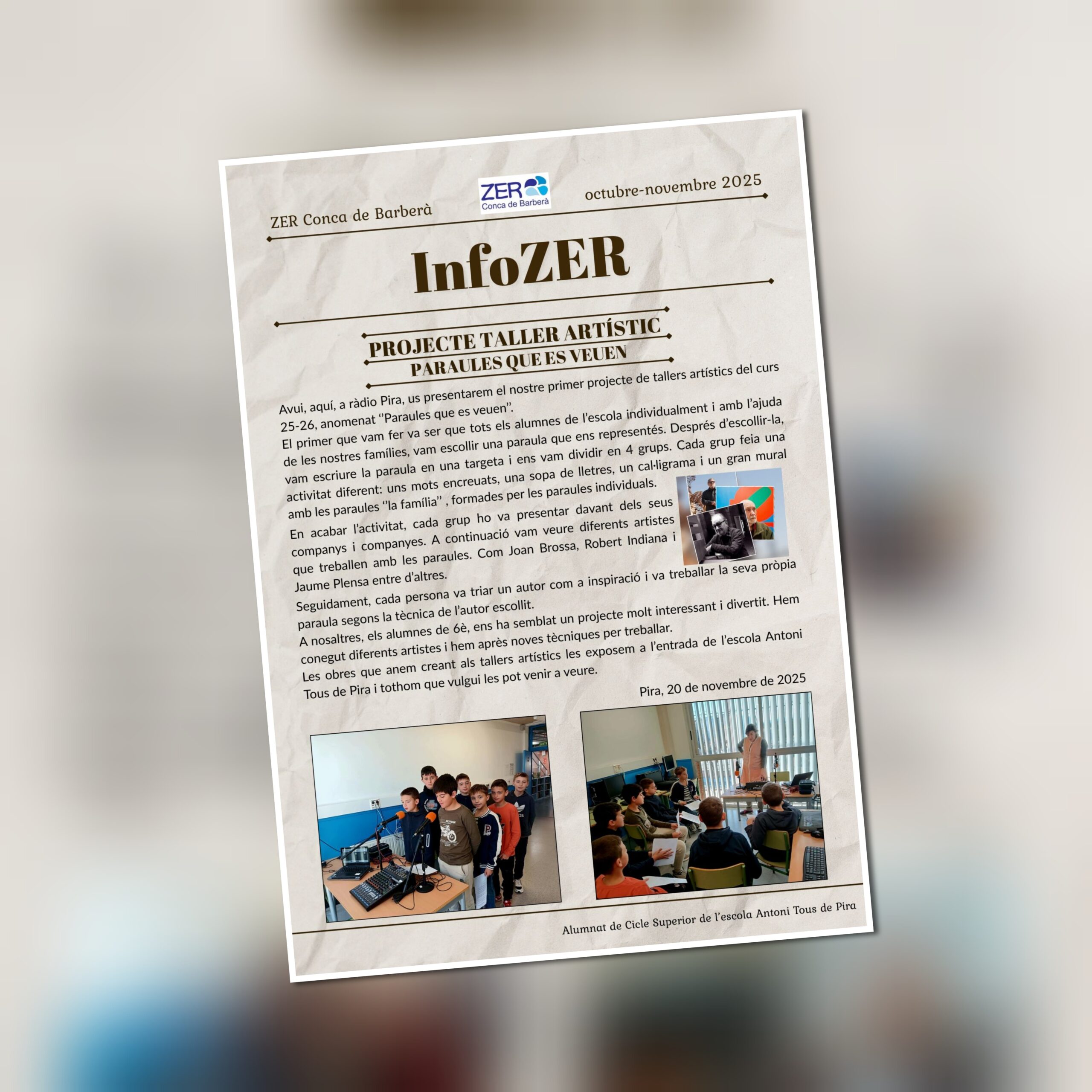 InfoZER: Els alumnes de 6è de l’Escola Antoni Tous de Pira, de la ZER Conca, han entrat a l’estudi de ràdio instal·lat en una de les aules de l’escola. Allà ens expliquen com s’ha desenvolupat el Projecte de Tallers Artístics que es duu a terme a totes les escoles de la ZER.