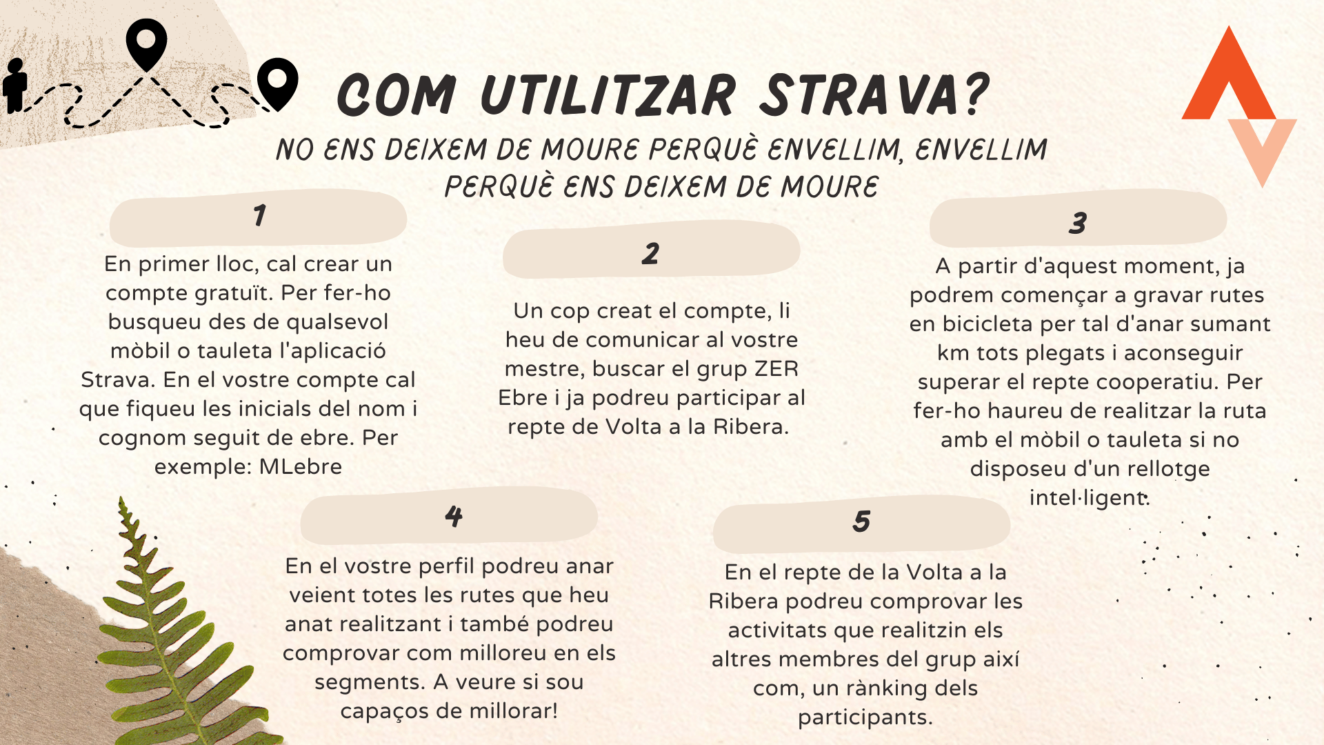 El projecte “Fem la volta a la Ribera d’Ebre” és una iniciativa cooperativa impulsat des de l’àrea d’educació física que consisteix en sumar quilòmetres en l’aplicació Strava per recórrer tota la zona de la Ribera d’Ebre. Els participants d’aquest projecte són els alumnes grans de la ZER Ebre, que poden involucrar-se en la mesura que ells/elles puguin o vulguin.