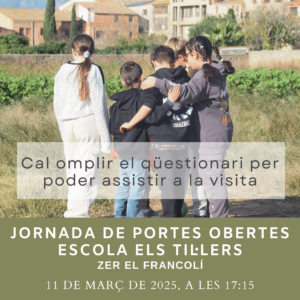 Les portes de les nostres escoles s’obren per rebre’t! Si estàs buscant un entorn educatiu proper, familiar i de qualitat, t’animem a venir a les Jornades de Portes Obertes de la ZER El Francolí. Descobreix com treballem, coneix l’equip docent i resol tots els teus dubtes!