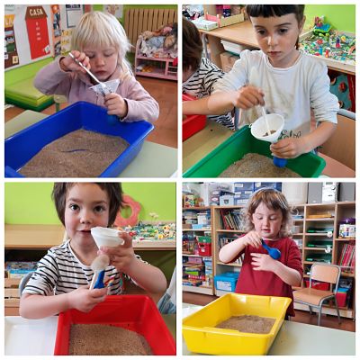 Mireu que concentrades estan les nenes d’infantil omplint els globus i intentant que la sorra arribi al fons.