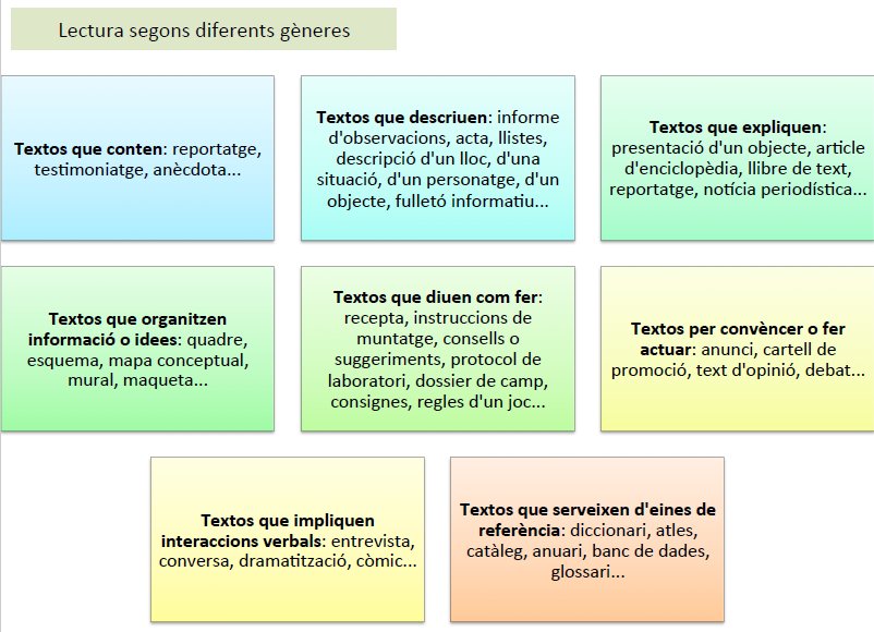 Documents: La competència lectora. La perspectiva de l’aprenentatge (paper de l’alumne/a i del/ de la docents). Components de la lectura (lector, text i activitat). Rúbrica anàlisis de textos. Guia i reflexió per al recull i anàlisis d’activitats de lectura dins l’àrea. Protocol de planificació i valoració de les activitats de lectura des de la perspectiva de l’alumne/a.
