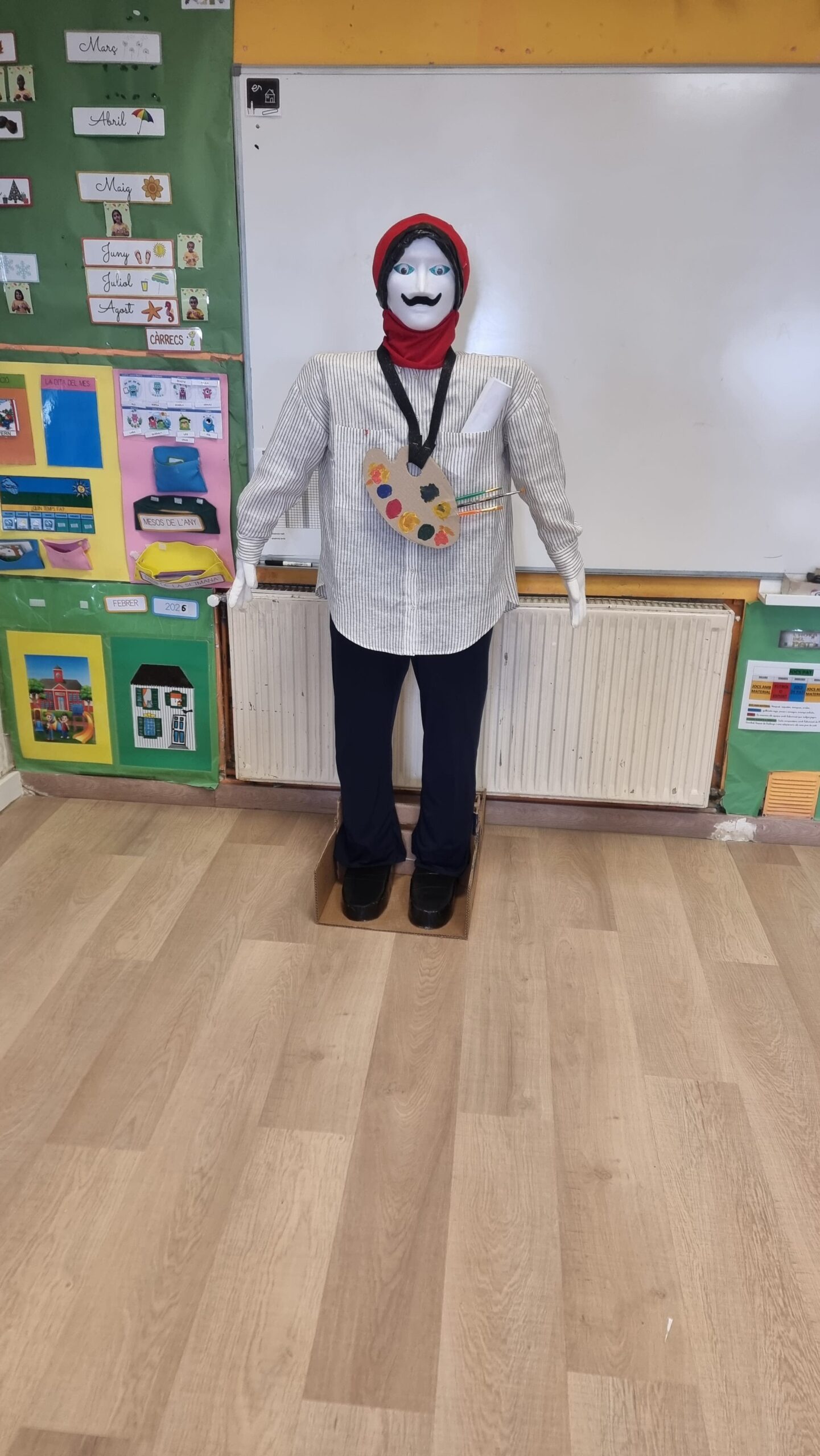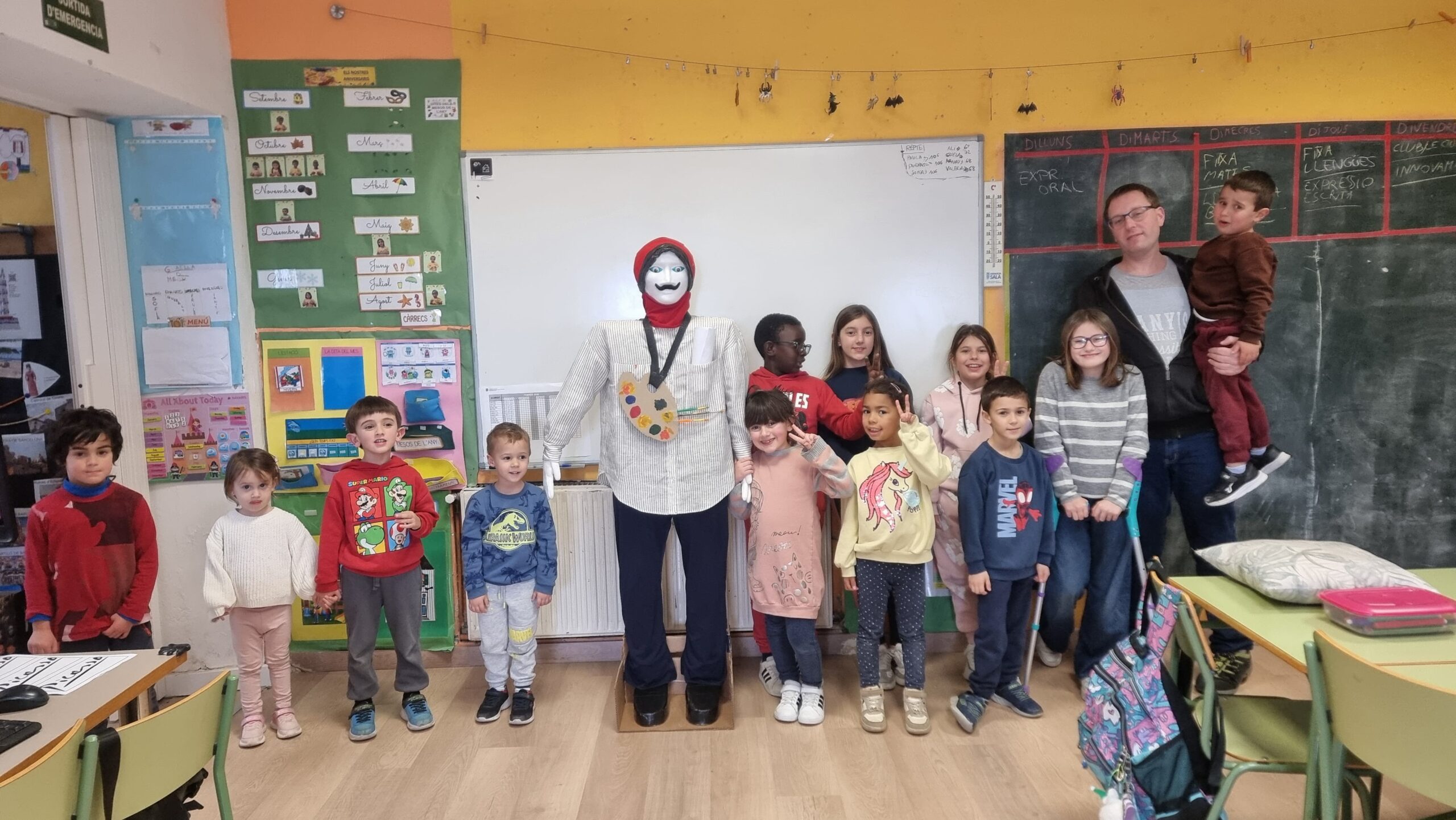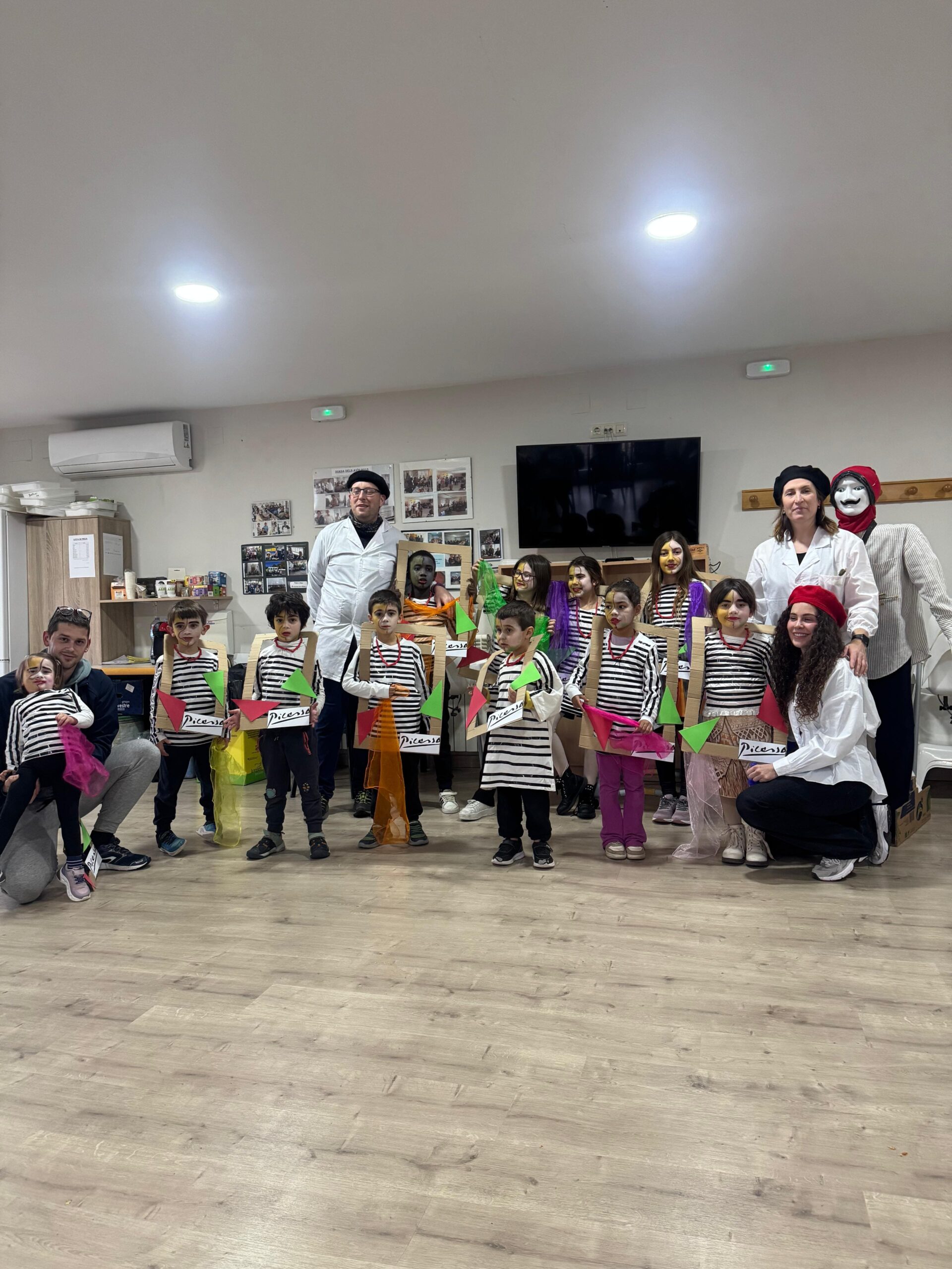 Explicar-vos que unes setmanes prèvies a la celebració d’aquesta festa, vam destinar unes sessions de l’àmbit d’Educació Artística a elaborar-nos la disfressa i els seus complements. Aquest any vam decidir anar d’un quadre de PICASSO, per tant, ens vam fer una samarreta decorada, un collaret de macarrons i els complements del quadre decorat i vam quedar tant autèntics com el quadre real.