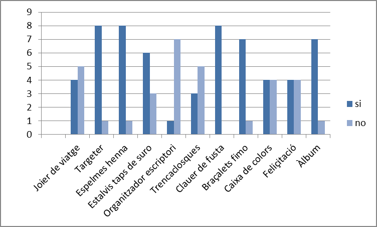 - Els mestres han valorat que el targeter, el clauer de fusta i les espelmes de henna creuen que si que ho comprarien perquè es necessari