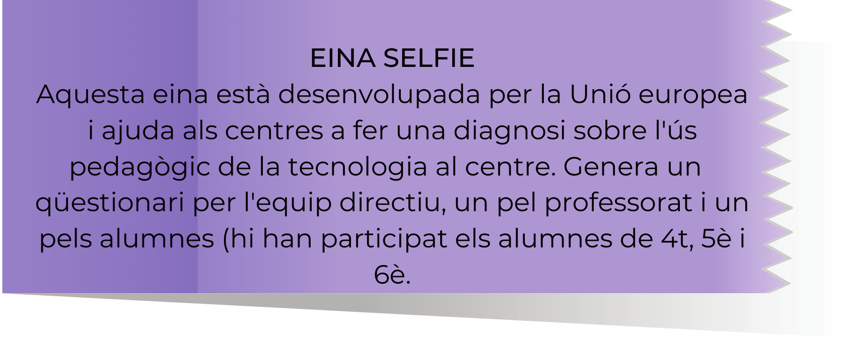 Diagnosi RESUM EINA SELFIE RESUM PARTICIPACIÓ COMUNITAT EDUCATIVA A partir de l’anàlisi d’aquestes eines, es detecten els punts forts i punts febles que ens permeten plantejar els objectius de l’estratègia digital.