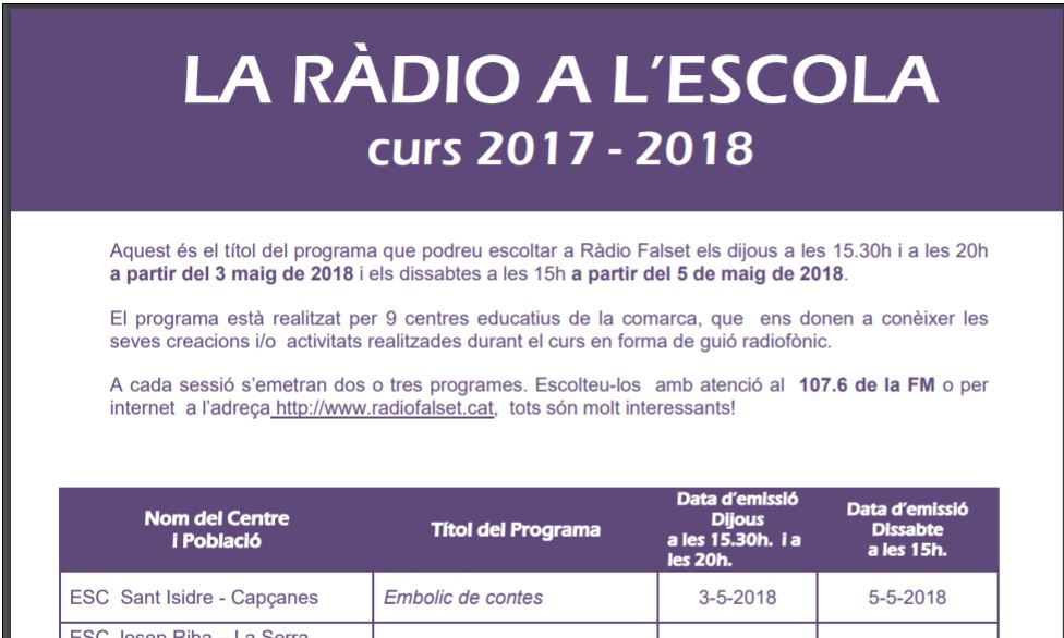 Aquí podeu veure el Cartell de les emissions de La Ràdio a l’Escola 2018