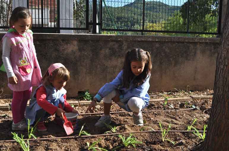 Avui toca posar en marxa l’hort. Sortim tots a la part del darrera de l’escola amb tots els estris i