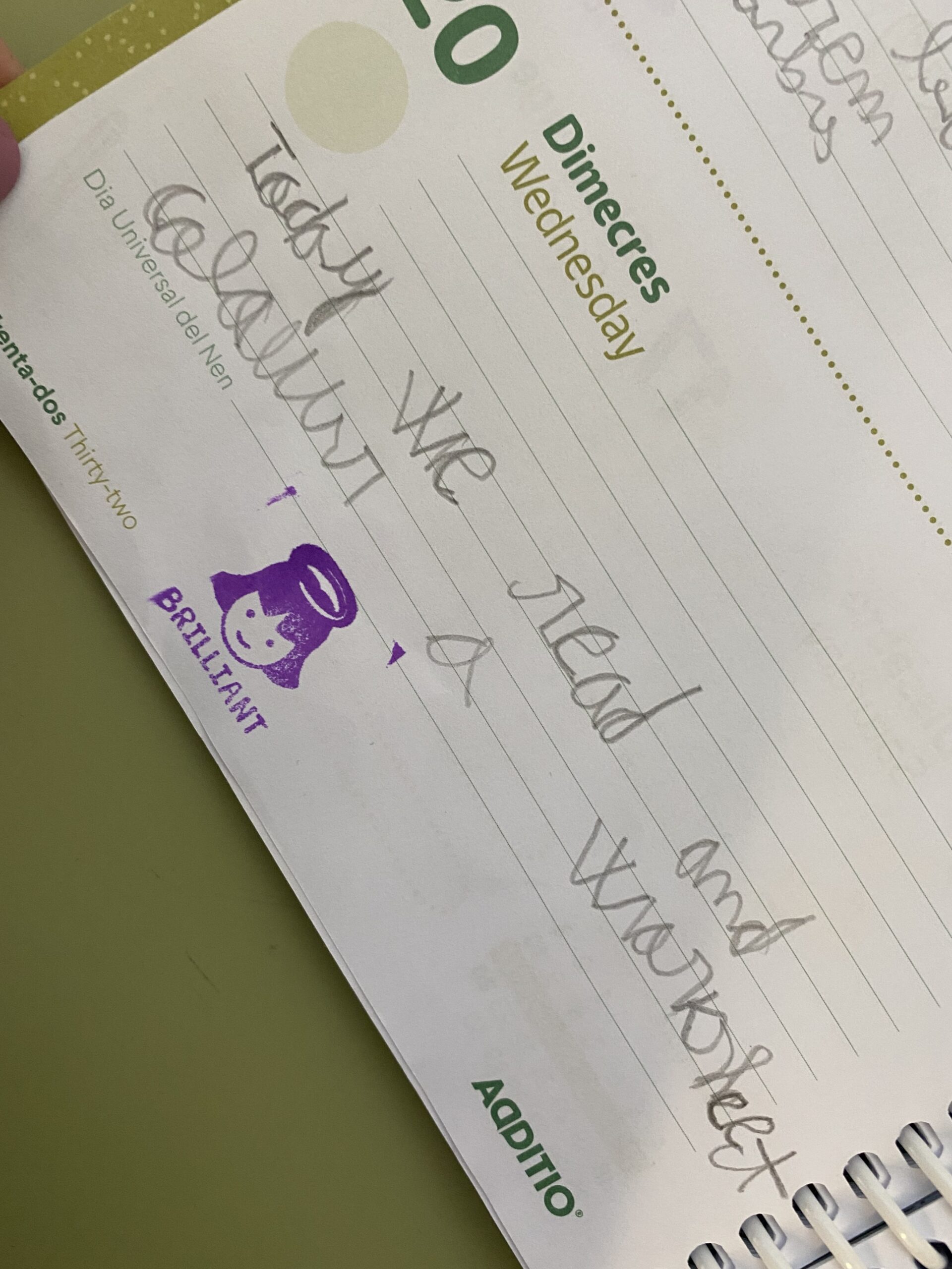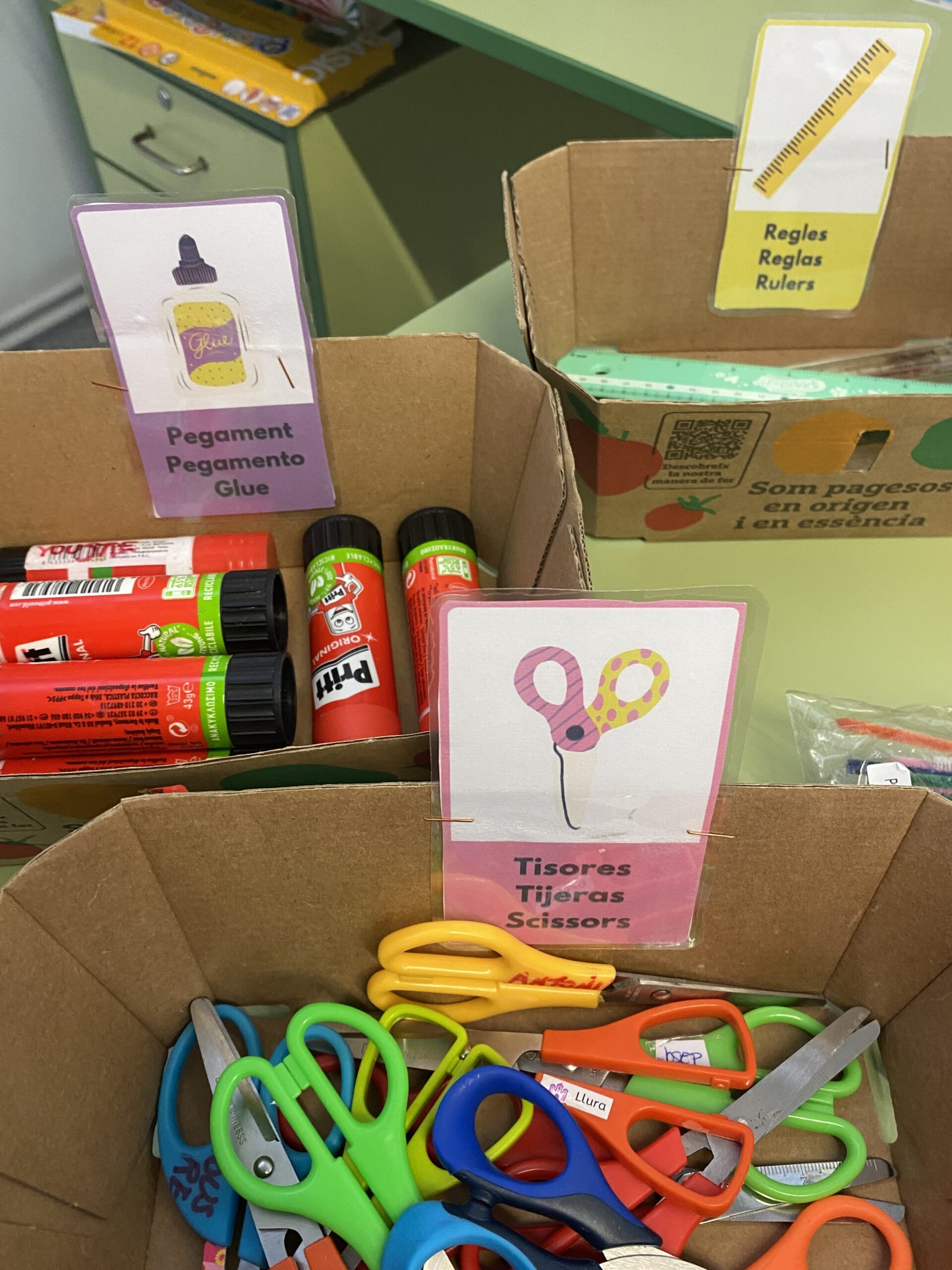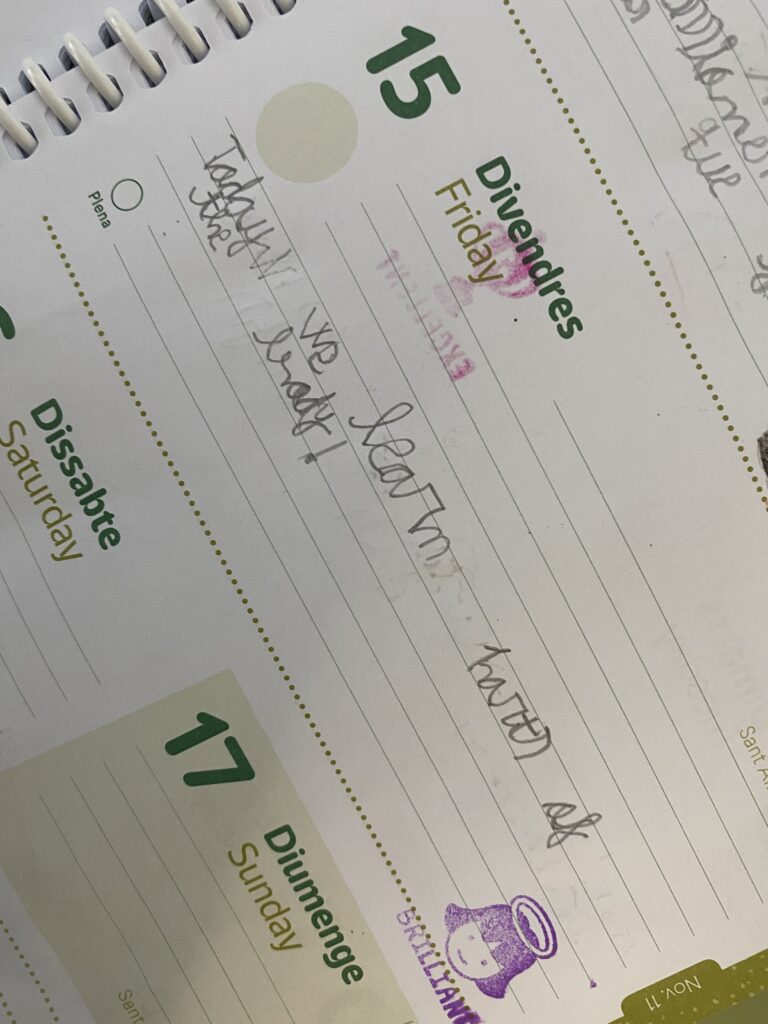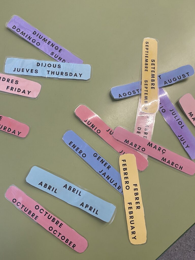 Després de la realització del Programa GEP, cada cop tenim més normalitzat l’ús de l’anglès a l’escola. Diàriament, escrivim la data en català, castellà i anglès; les nostres aules tenen etiquetat tot el material en aquestes tres llengües; a més, plantegem reptes a l’alumnat redactats en llengua anglesa i, com a part de comunicació diària amb les famílies, determinats dies escrivim la informació en anglès a les agendes informant sobre alguna cosa especial que ha passat o hem après.