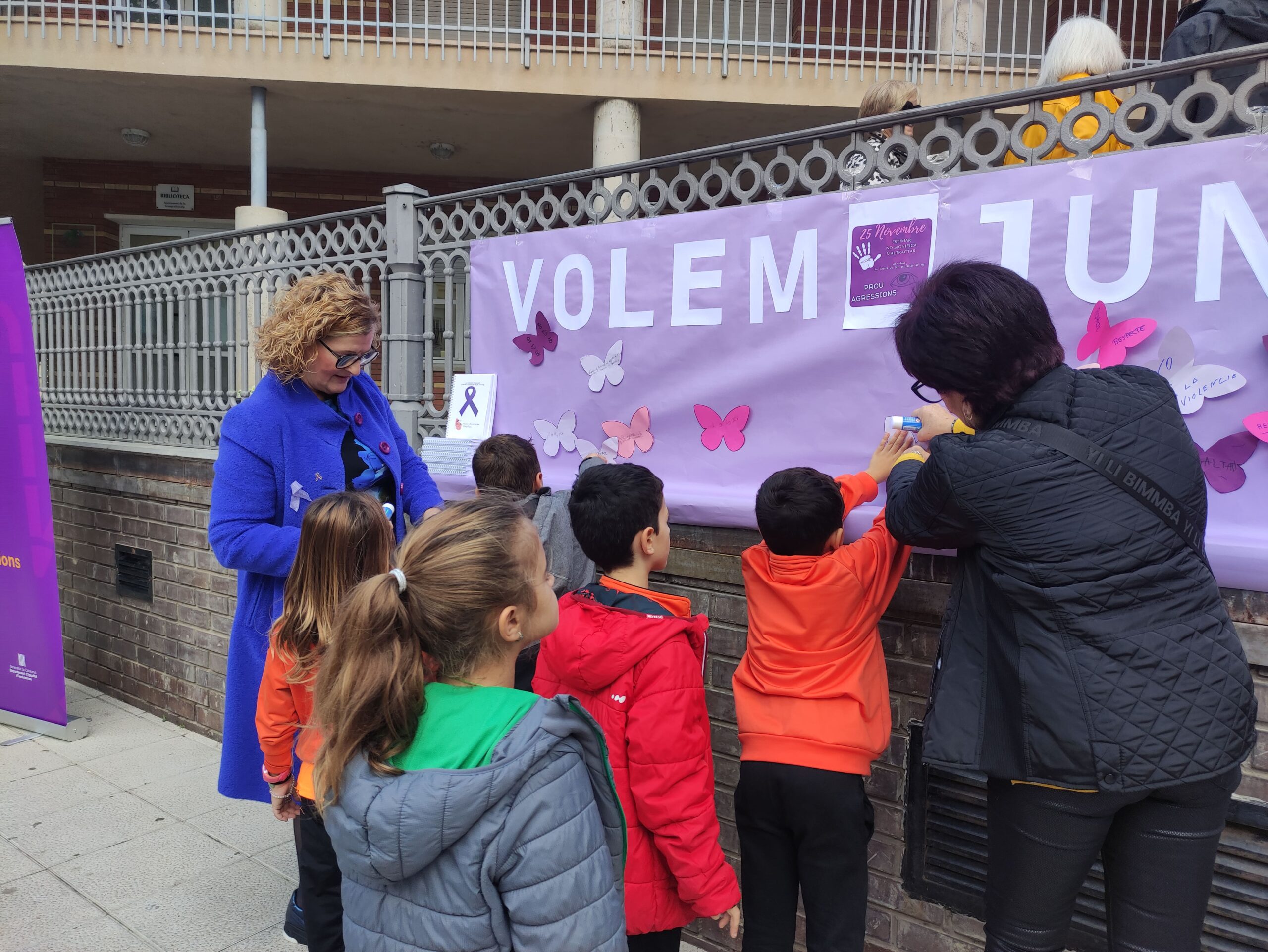 Avui divendres hem participat en l’acte que s’ha dut a terme a nivell municipal a la plaça del poble. Hem escoltat el manifest llegit per diferents dones del poble davant d’un llaç gegant fet amb paraigües de color lila i a continuació hem enganxat unes papallones amb frases nostres en un mural amb el lema «VOLEM JUNTES».