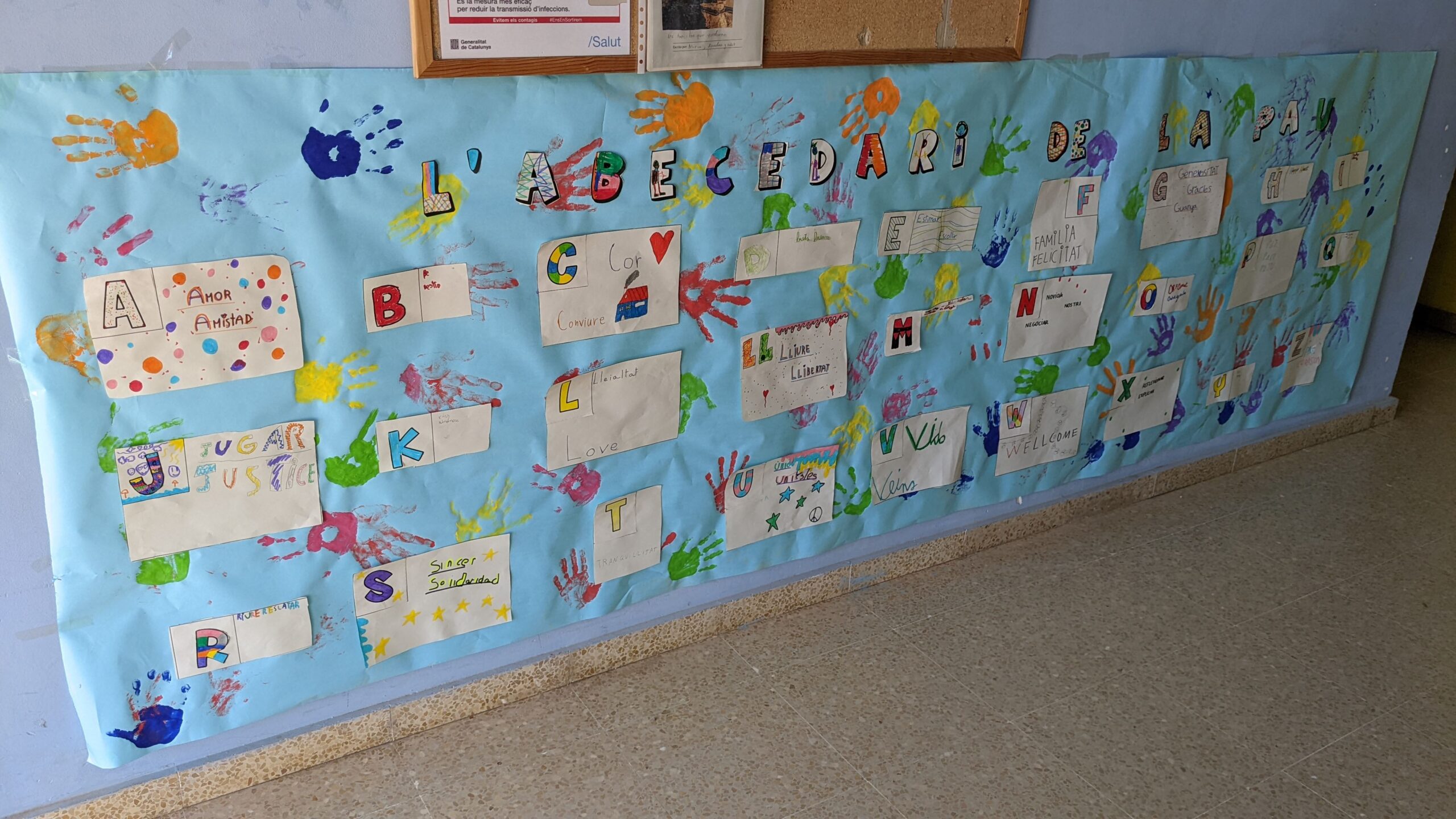 A l’Escola Arc d’Adà vàrem crear el nostre abecedari de la Pau. Primerament, vam parlar sobre el simbolisme d’aquest dia tan especial i les seves implicacions. A continuació vam cercar entre tots i totes paraules que comencessin amb les diferents lletres de l’abecedari, ja fossin en català, castellà o anglès. Més tard, ens vam organitzar per tal de crear-ne els cartells i construir el mural entre tots i totes.