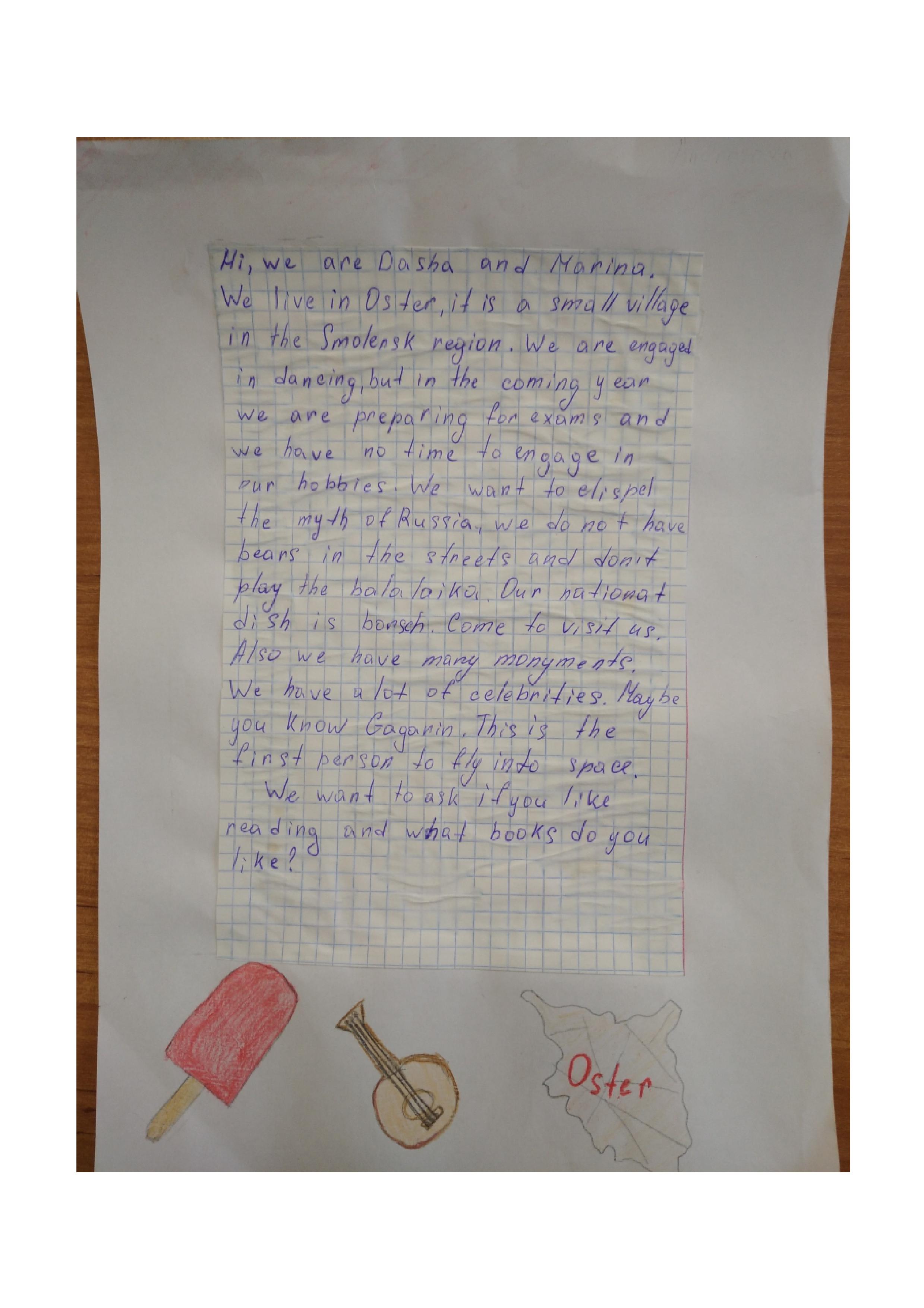 Aquesta setmana hem rebut resposta a les cartes en anglès que vàrem enviar a l’escola Oster de Rússia. Aquest intercanvi l’hem fet a través d’una plataforma de la Cambridge Assessment, que ja fa anys que treballa en aquests projectes per afavorir la relació escolar internacional dins del marc de la llengua anglesa com a segona llengua d’aprenentatge. Ens sentim força orgullosos de participar-hi i esperem continuar dins d’aquesta iniciativa, per a la qual cosa només necessitem voler-ho. Els i les nostres alumnes de cicle superior van escriure les seves cartes responen al model “Where I live” on explicaven el lloc on viuen i ara dins la mateixa etiqueta hem obtingut resposta. Els alumnes de la Oster ens expliquen qui són, què els agrada i com és el lloc on viuen.