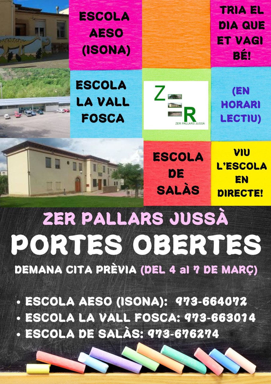 Des del 4 fins al 7 de març, a les escoles de la ZER hem organitzat unes jornades de portes obertes en horari lectiu, perquè les famílies pugueu conèixer els centres per dins, el seu funcionament i el nostre projecte educatiu. Podeu posar-vos en contacte amb cada escola i concertar la visita amb el centre .