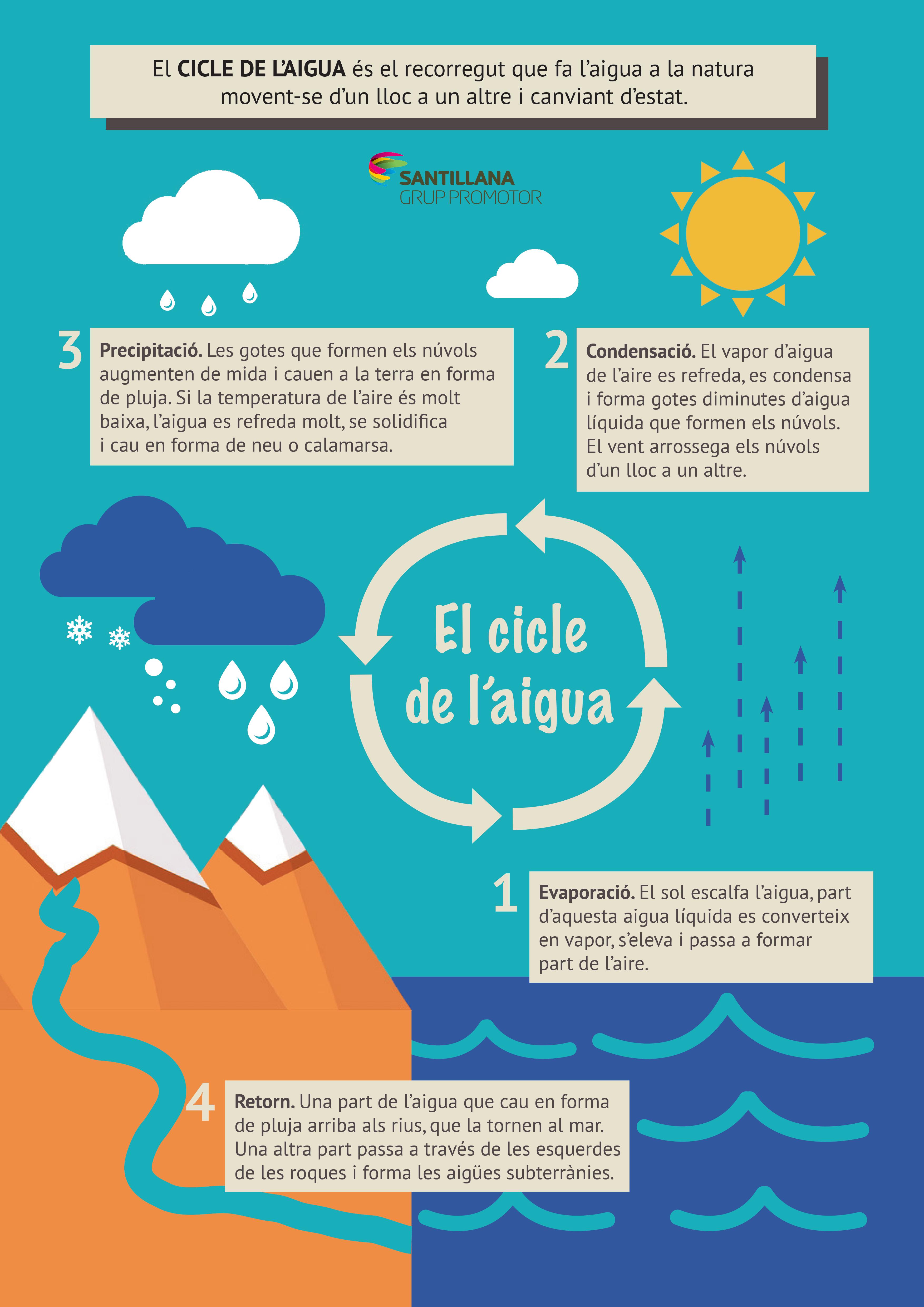 El cicle de l’aigua és el recorregut que fa l’aigua, movent-se d’un lloc a un altre i canviant d’estat, originant les pluges, calamarsa o neu. Voleu saber-ne els passos?
