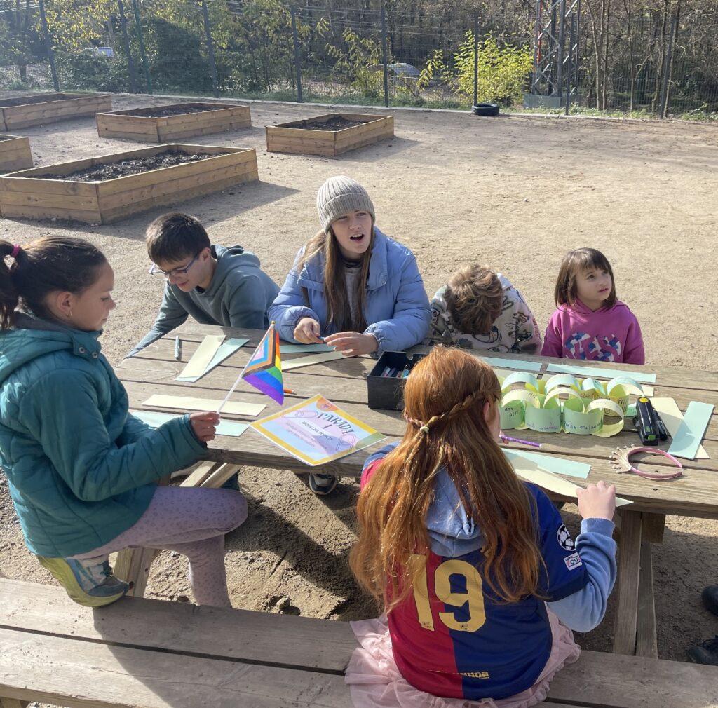 D’altra banda, els alumnes de cicle superior i mitjà van fer una gimcana de sensibilització amb el col·lectiu trans. Aquesta consistia en unes dinàmiques pensades per visibilitzar i celebrar les realitats trans, així com per fomentar el respecte, la inclusió i la diversitat entre l’alumnat. A través de tres jocs els infants van parlar del respecte, van fer un joc de descoberta de personatges no binaris o trans de pel·lícules, sèries o jocs infantils i també van caracteritzat un company/a per reflexionar sobre l’acceptació i respecte vers tothom vagi com vagi.