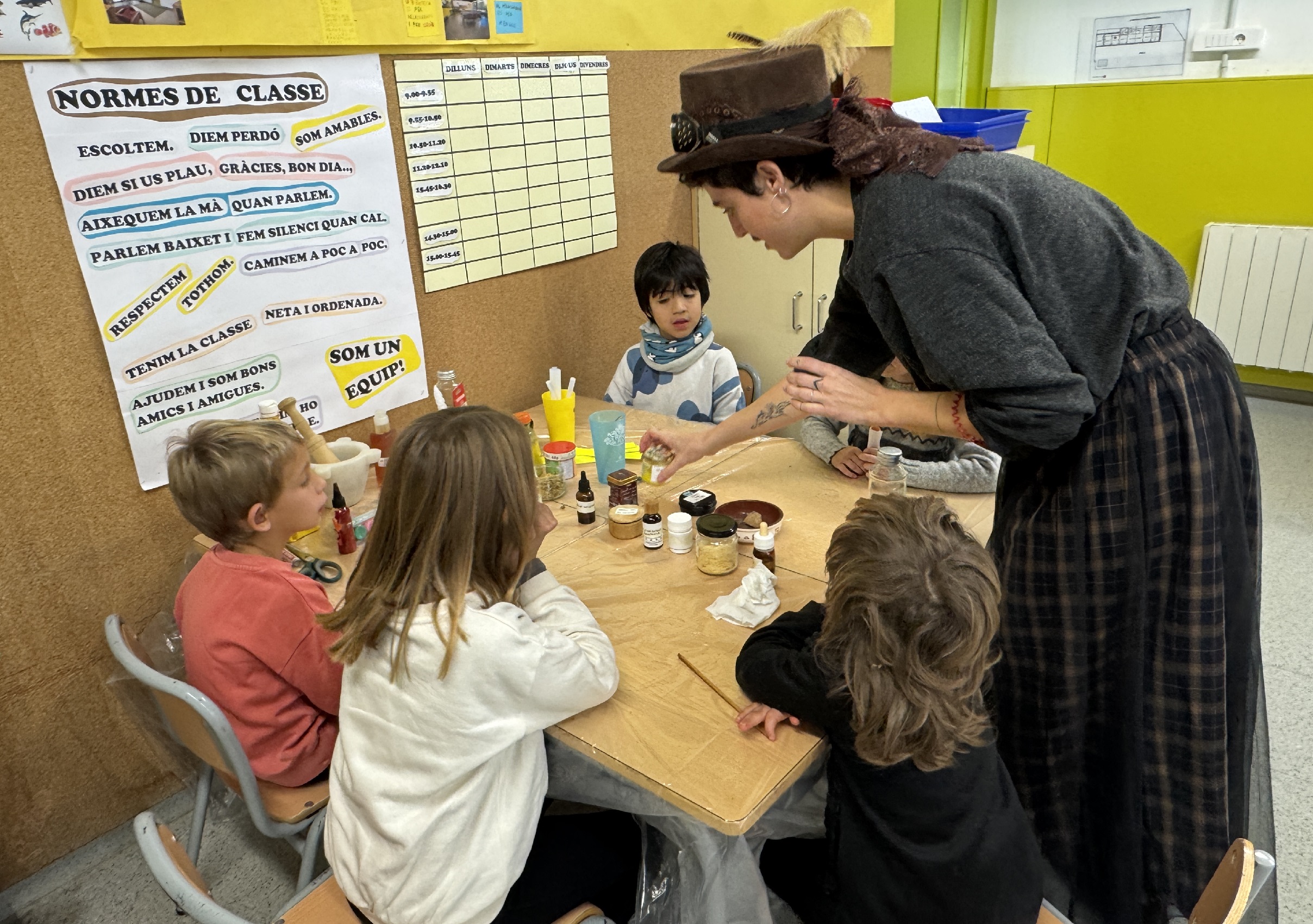 Els alumnes d’infantil i cicle inicial van sentir el conte “les bruixes d’Arlet”. A partir d’aquesta història es va fer un taller que convidava a jugar amb la màgia i a crear pocions amb olis essencials, herbes aromàtiques i altres elements fantàstics, les quals servirien per connectar amb les seves emocions i les dels altres.