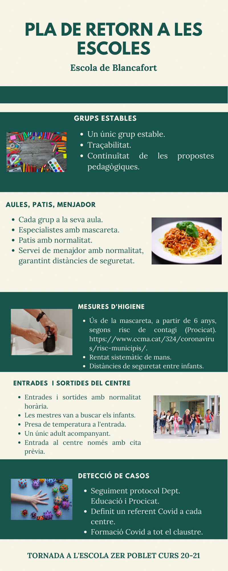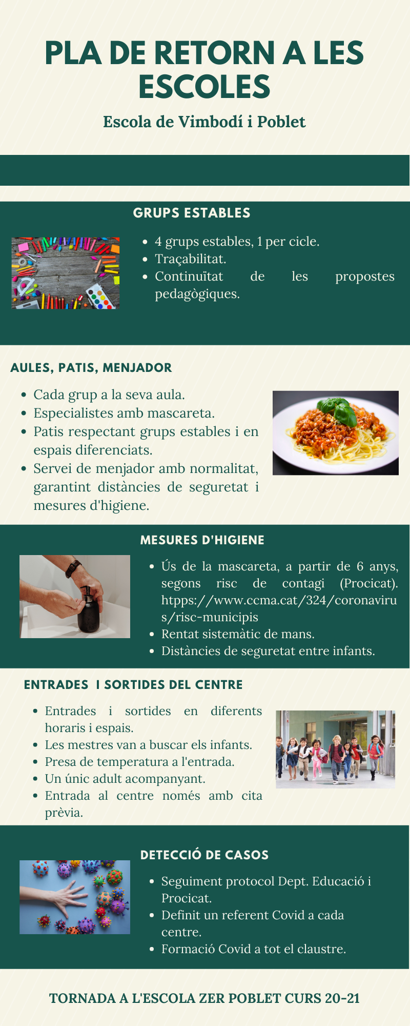 Per altra banda, adjuntem una infografia de cada escola que resumeix i destaca els temes més importants d’aquests plans de reobertura: