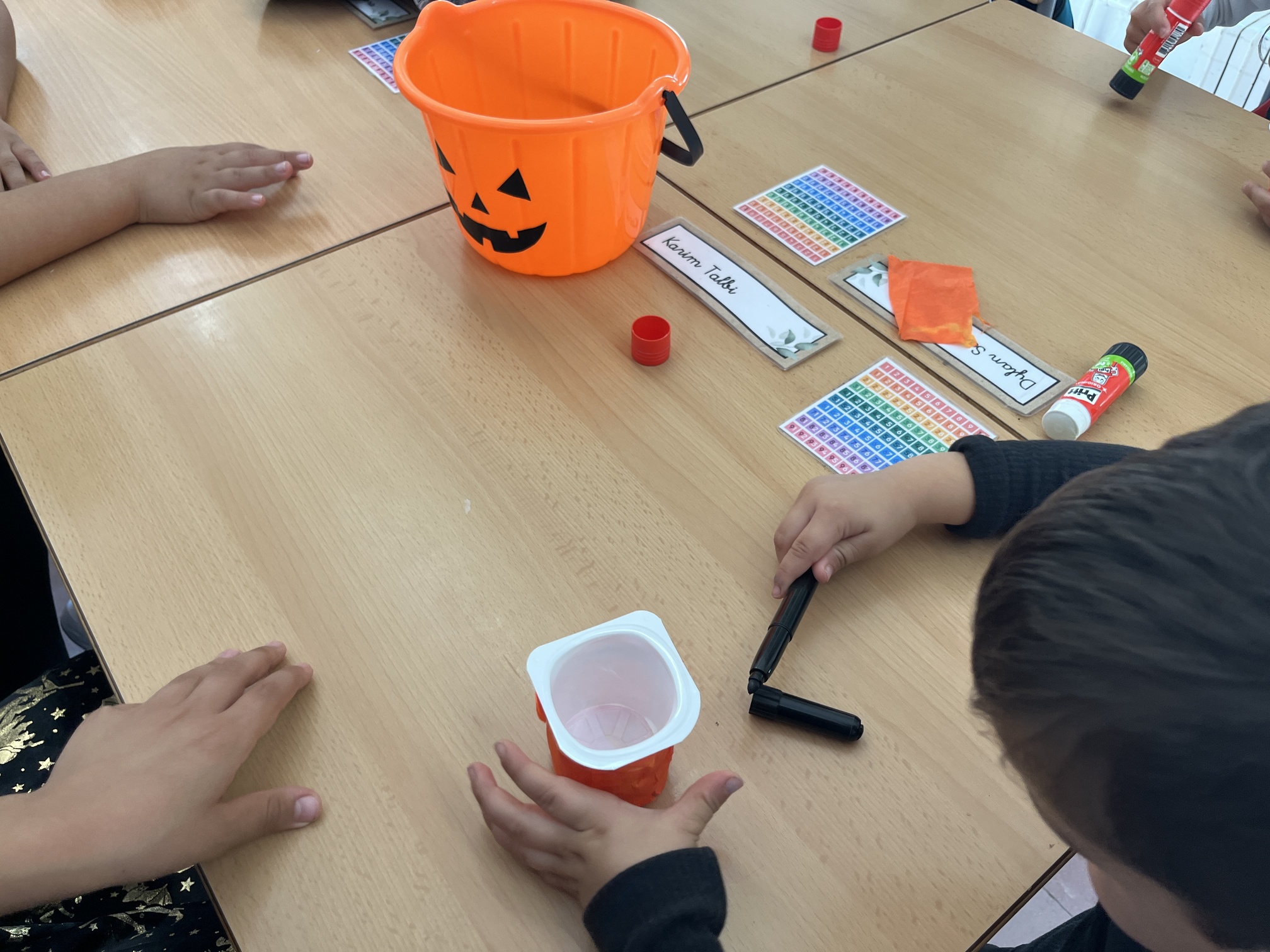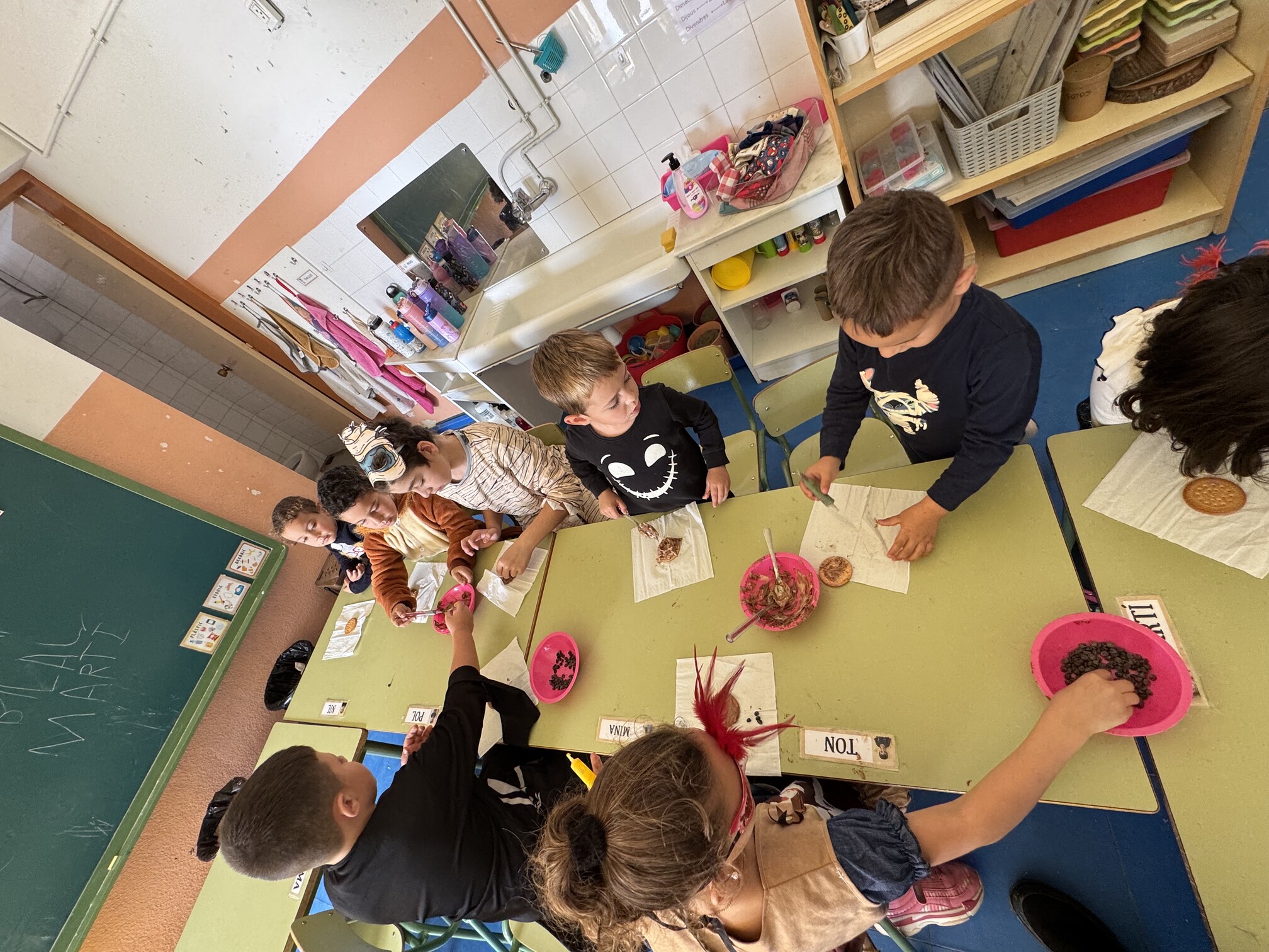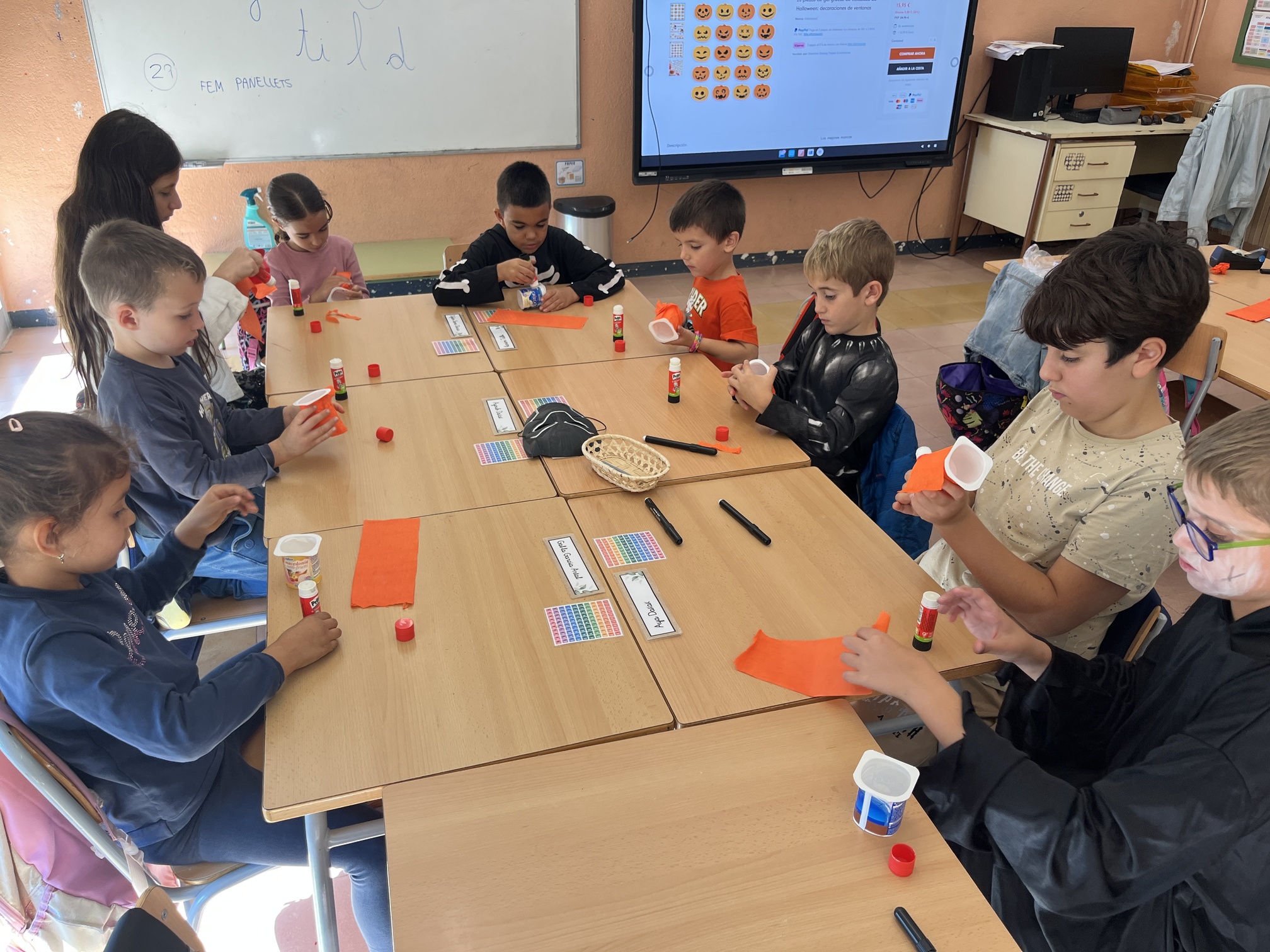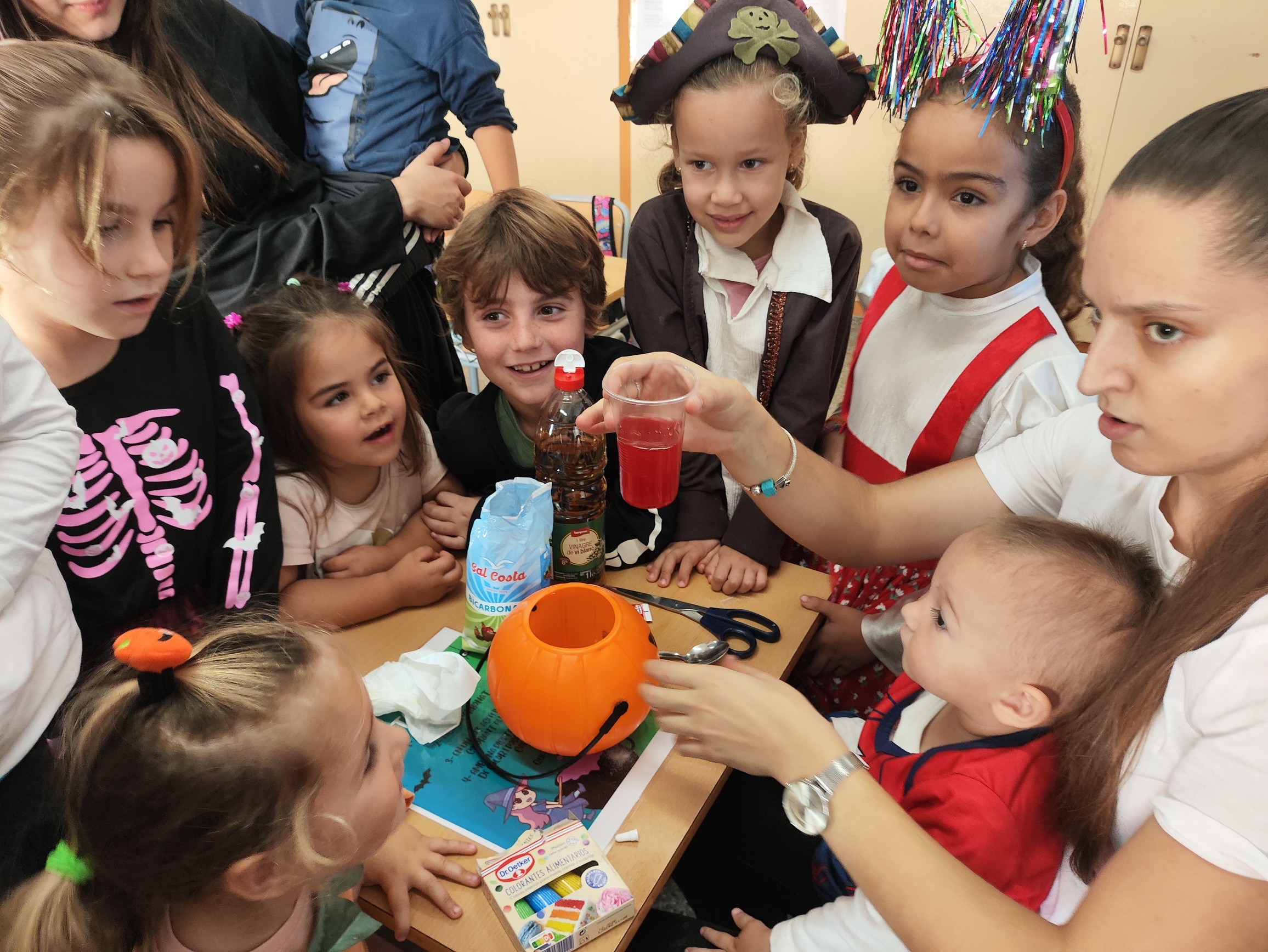 Dos dels tallers consistien en elaborar manualitats de Halloween. D’una banda, vam crear monstres amb rolls de cartró i diferents plantilles d’ulls, orelles, mans, potes, etc. D’altra banda, la segona manualitat consistia en elaborar una “Jack-o’-lantern” amb un pot de iogurt. Vam folrar els pots amb paper taronja, li vam dibuixar una cara monstruosa a la carabassa i, un cop a casa, vam poder posar a l’interior una espelmeta per fer la nostra pròpia llanterna de Halloween. El tercer taller consistia en preparar unes galetes terrorífiques amb melmelada i per últim, ens vam convertir en bruixes i bruixots i vam elaborar una poció realitzant un experiment molt divertit.