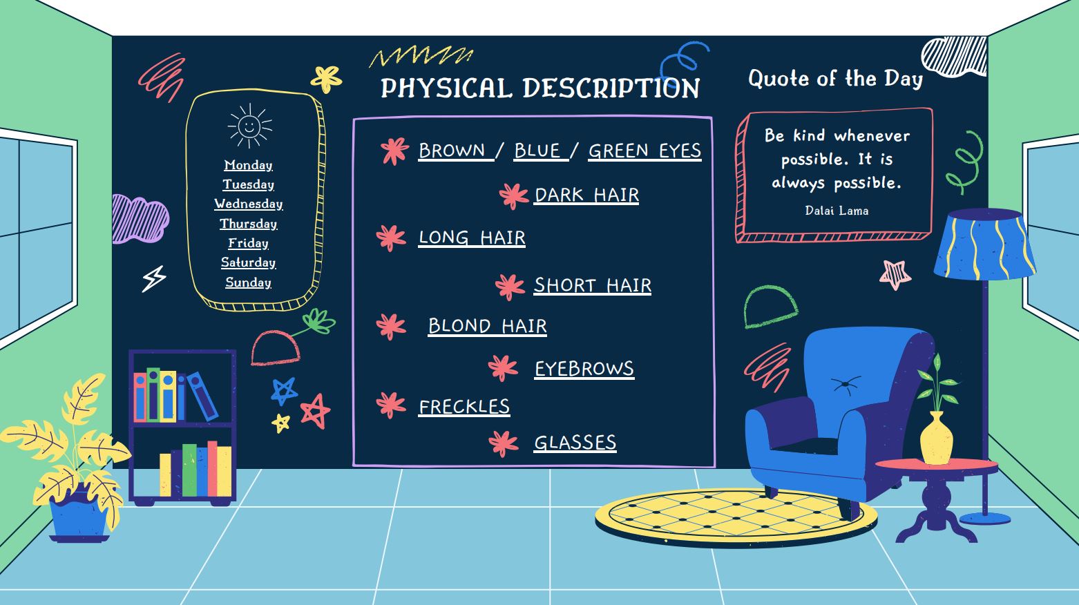 Hello! A cicle inicial hem creat una aula virtual per treballar la descripció física en anglès. Si feu clic damunt de les diferents paraules de la pissarra, us apareixeran les persones de la classe amb aquell tret físic. Si cliqueu damunt dels dies de la setmana, podreu escoltar la cançó “Days of the week song”. Per accedir a l’aula virtual heu de fer clic damunt del següent enllaç: